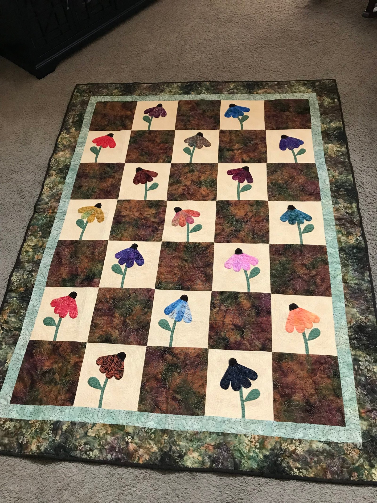 I bought this pattern in Kansas in 2008 because of a visit I made through Kansas and couldn’t help but notice the beautiful wildflowers and sunflowers blowing in the wind in the open fields. I pieced and quilted it in 2011 and entered it in the Lancaster County super fair. It was in the hand quilted section and the judges could not believe that it was not machine quilted because of the tiny echo stitching (row after row of hand stitches surrounding a flower). I had no idea what I was getting into and how it might turn out, but it worked! I won first place and a blue ribbon!